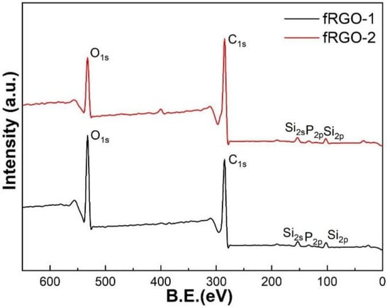 XPS was used to study the elementary composition and chemical status of fRGO-1 and fRGO-2 samples. As shown in Figure 5, five characteristic peaks centered at 532.2 eV, 286.0 eV, 153.4 eV, 133.9 eV and 102.0 eV exist in the XPS spectra of fRGO-1 and fRGO-2, corresponding to O, C, Si2s, P2p and Si2p, respectively. Table 2 clearly lists the atomic ratios of C, O, Si and P elements. The C/O atomic ratio of fRGO-2 reaches up to 4.77 and greatly exceeds the C/O ratio of fRGO-1 (2.60) due to a higher graphitic degree of fRGO-2. The silicon content of fRGO-1 (3.77%) is slightly higher than that of fRGO-2 (3.39%), which is ascribed to more oxygen-containing groups of RGO-1 inducing the hydrolytic condensation of siloxane. However, the phosphorus content of fRGO-1 is 1.21%, which is slightly lower than that of fRGO-2 (1.37%). The abnormal result is possibly attributed to a greater insertion reaction of DOPO molecules into RGO-1 interlayers, but more DOPO molecules are grafted onto the RGO-2 surface.