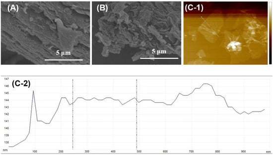 SEM images of (A) fRGO-1 and (B) fRGO-2and AFM image (C-1) and its height profile (C-2) of fRGO-1.