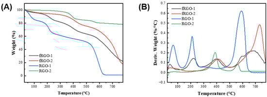 TG (A) and DTG (B) curves of RGO-1, RGO-2, fRGO-1 and fRGO-2 under air atmosphere.