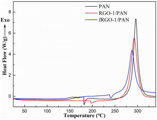DSC curves of pure PAN, RGO-1/PAN and fRGO-1/PAN composites.
