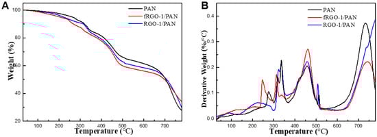 TG (A) and DTG (B) curves of PAN, RGO-1/PAN and fRGO-1/PAN composites under air atmospheres.