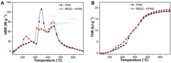 (A) HRR and (B) THR curves of pure PAN and fRGO-1/PAN composites.