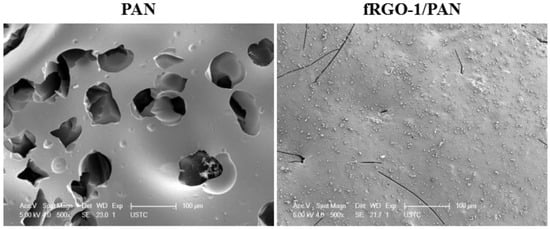 SEM was used to observe the morphology of the char residues after the combustion of pure PAN and fRGO-1/PAN composites. As shown in Figure 13, the external char residues of pure PAN have many large pores, resulting in poor barrier action against thermal activity and smoke. In contrast, the external char residues of fRGO-1/PAN composites show a relatively denser appearance, effectively preventing the transfer of combustible heat and pyrolysis gasses.