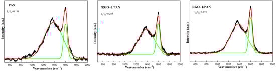 Raman spectra of char residues after combustion of PAN and fRGO-1/PAN composites.