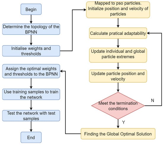 BPNN models exhibit drawbacks such as low training speeds and tendencies towards local optima []. The PSO-BP approach facilitates enhanced convergence velocity and prediction precision by mapping and optimising the parameters of the BPNN to the PSO particles. Figure 1 illustrates the procedural flow of the PSO-BPNN methodology.