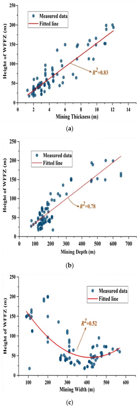 - Mining depth. After a given coal seam has been mined, the overlying strata exhibit movement and damage due to the mine pressure, resulting in the formation of the WFFZ. In accordance with the mine pressure theory, the mine pressure is observed to increase with increasing depth within a burial depth range of 25 to 2700 m. This results in greater damage to the surrounding layers of rock and a corresponding increase in the height of the WFFZ [].