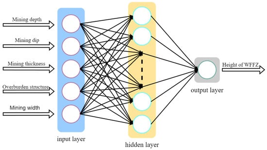 In accordance with the data presented in Table 1, the mining thickness, mining depth, mining width, mining dip and overburden structure were identified as the primary characteristics of the input data for the BPNN. Concurrently, the height of the WFFZ was designated as the NN model’s output target. In accordance with Hecht–Nielsen’s theory, a BPNN model comprising a single hidden layer is capable of approximating any nonlinear function with exceptional precision. Therefore, in building our model, a network structure with three layers was chosen: an input layer, a hidden layer and an output layer.