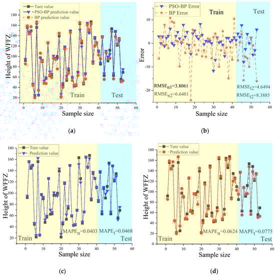 Prediction results: (a) comparison of the dataset of the height of the WFFZ with the actual values; (b) comparison of the PSO-BPNN and BPNN error results for the dataset; (c) PSO-optimised BPNN predictions of the height of the WFFZ compared to the actual values; (d) results of matching the BPNN predictions of the height of the WFFZ before PSO implementation to the actual values; (e) results of matching the BPNN predictions to the actual values; (f) results of matching the BPNN predictions prior to PSO implementation to the actual values; (g) box plot of the errors before and after optimising the BPNN via the PSO algorithm.