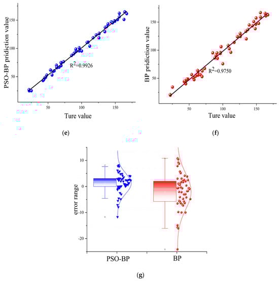 Figure 4 shows the BPNN predictions versus the actual values before and following PSO implementation. Before PSO implementation, the mean absolute error was −1.9, which occurs within the range of (−5.73, 2.02). After optimisation, the mean absolute error was 1.16, which occurs within the narrower range of (0, 3.08), with a significant improvement in the absolute error, as shown in Figure 4g. The error distributions of both the PSO-BPNN model and the BPNN model show normal distributions. However, the distribution curve of the PSO-BPNN model has a higher peak and is relatively “slim and tall”, whereas the distribution curve of the BPNN model has a lower peak and appears “flat”. The “slim and tall” error distribution is more concentrated, with a smaller range of positive and negative errors. In contrast, the ‘flat’ error distribution is more dispersed, with a wider range of positive and negative errors. It can be seen that the standard deviation of the errors in the PSO-BPNN model is smaller than that in the BPNN model. Specifically, after PSO implementation, the coefficient of determination R2 for the training set was 0.9928, and the mean absolute percentage error (MAPE) was 0.0403. In addition, the R2 value was 0.9832, and the MAPE value was 0.0468. Before PSO implementation, the R2 value for the training set was 0.9757, and the MAPE value was 0.0624. In addition, the R2 value was 0.9677, and the MAPE value was 0.0775. The root means square error (RMSE) for the training set decreased from 4.6494 to 3.8061, and that for the test set decreased from 8.3885 to 6.6481. The goodness of fit R2 value improved from 0.9750 to 0.9926 before and after PSO implementation.
