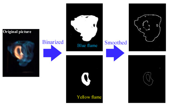 Digital image processing technology was employed to analyze flame characteristics by obtaining surface feature points and coordinates from images captured during the combustion process [24]. A high-speed camera recorded the flame images in real time, saving them as digital video files for further analysis. Flame frames from each ignition test were extracted and processed using a custom Matlab program. The original high-speed camera images reveal two distinct flame types: blue and yellow. A noticeable “edge jitter” effect was observed during the flame development, characterized by numerous sharp corners along the flame edge, which varied irregularly over time [25]. Flame images were segmented based on color characteristics [26], and the edge jitter was accounted for using flame sharp angle processing principles. This allowed for the separation of the flame from its background, facilitating a more accurate extraction of the flame edges. The result was a more precise flame profile, minimizing errors in subsequent data processing [27]. The process is illustrated in Figure 1.