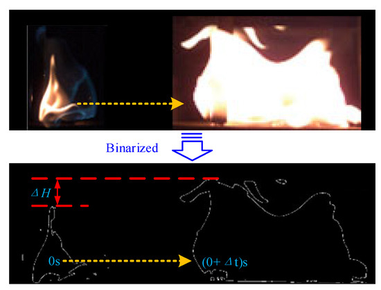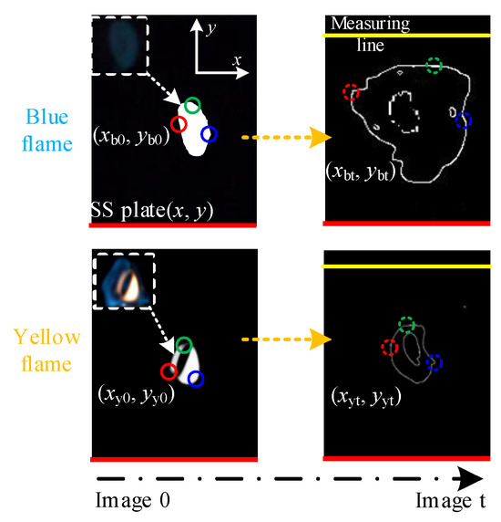 In Figure 3, the edge pixels of the blue flame in the first frame (Image 0) are denoted as (xb0, yb0), and the edge pixels of the yellow flame in the same frame are denoted as (xy0, yy0). Similarly, the edge pixels of the blue flame in the t-the frame (Image t) are defined as (xbt, ybt), and those of the yellow flame as (xyt, yyt). The pixel coordinates on the upper surface of the hot SS plate are represented as (x, y), with a measurement line set at a height of 80 mm from the surface of the SS plate. Using the pixel positions of both the flame and SS plate, combined with Chebyshev’s theorem [35] to scale the flame image’s feature edges, the flame height is calculated as shown in Equation (4).