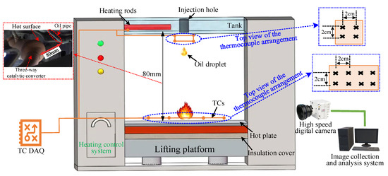 In this paper, the hot surface ignition test was carried out using the experimental platform for the hot surface ignition. The experimental platform mainly includes the lifting platform, temperature testing system, and image monitoring system; the system arrangement is shown in Figure 5.