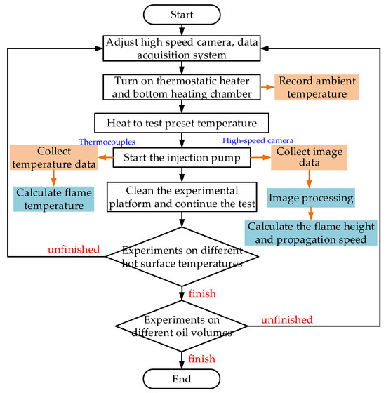 According to the test design of this paper, the hot surface ignition test of the automotive lubricant ignition is carried out by considering the effects of the oil volume and hot surface temperature on flame combustion characteristics. The specific test process is shown in Figure 6.