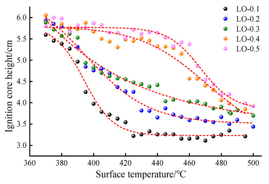 As can be seen from Figure 8, the hot surface temperature is one of the main factors leading to the lubricant ignition core height. The lubricant ignition core height decreases exponentially with the increase in the hot surface temperature under different oil volumes. Further analyzing Figure 8, it is evident that at lower hot surface temperatures (370 °C to 390 °C), the ignition core height of the lubricant is relatively high, ranging from 5.5 to 6 cm from the hot plate, with minimal variation between different oil quantities. As the hot surface temperature further increases (390~480 °C), the ignition core heights for low oil quantity lubricant samples (LO-0.1, LO-0.2, LO-0.3) decrease rapidly with the temperature rise, eventually stabilizing. Conversely, the ignition core heights for high oil quantity lubricant samples (LO-0.4, LO-0.5) decrease gradually before accelerating. Near 480 °C, the ignition core heights for all oil quantities are reduced to 3–4 cm from the hot plate. Further temperature increases cause the ignition core heights to initially decrease before stabilizing, with lower oil quantities resulting in relatively lower ignition core heights. This phenomenon is primarily due to the increased evaporation rate of the lubricant at higher temperatures, leading to a fuel vapor cloud around each oil droplet. When the oil droplet quantity is small, the lubricant evaporates entirely before reaching the boundary layer, causing the combustible concentration at the boundary layer to reach ignition levels closer to the hot plate, thereby resulting in a lower ignition core height.