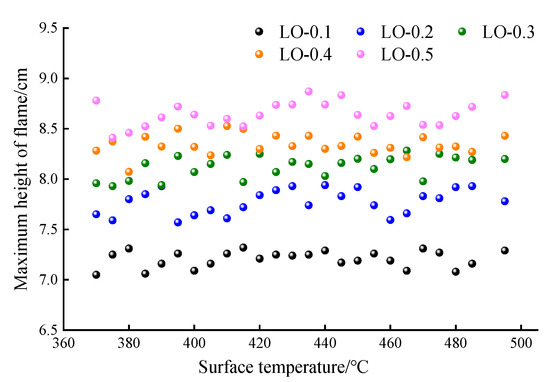 Figure 9 shows that the initial hot surface temperature influences the maximum thermal flame height less but also shows a clear positive correlation with the oil volume. Specifically, the maximum thermal flame heights are as follows: for LO-0.1, between 70.3 and 73.2 mm; for LO-0.2, between 75.7 and 79.5 mm; for LO-0.3, between 79.3 and 82.5 mm; for LO-0.4, between 82.2 and 85.2 mm; and for LO-0.5, between 84.6 and 88.7 mm. This indicates that (1) the maximum hot flame height tends to increase with the oil volume, although the increase is relatively modest. This is due to the substantial temperature and concentration gradients at the flame boundary, which result in significant heat and mass exchange and promote further chemical reactions in the gas mixture near the flame. (2) At an oil volume of 0.2 mL (LO-0.2), the maximum hot flame height at a hot surface temperature of 500 °C is 79.5 mm, which is nearly equal to the distance between the oil pipe and the hot surface (80 mm). This height poses a considerable fire risk to the oil pipe, increasing the likelihood of a vehicle fire. For oil volumes exceeding 0.3 mL (LO-0.3), the hot flame height exceeds 80 mm, further elevating the risk of combustion and potential vehicle fire.