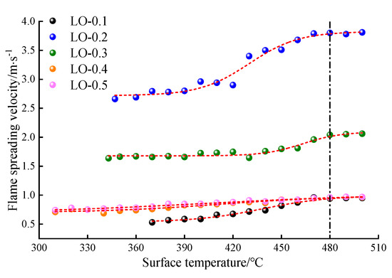 As shown in Figure 10, the hot surface temperature is one of the main factors affecting the flame propagation velocity. Under different oil volumes, the flame propagation velocity increases with the increase in the hot surface temperature. When the hot surface temperature reaches 480 °C, the growth trend of the flame propagation velocity slows down until smooth. Through the function fitting obtained, in a specific temperature range, the flame propagation velocity of the lubricating oil combustion and the hot surface temperature combine to meet the Boltzmann relationship, that is: