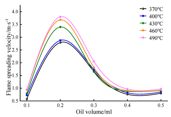 It can be seen from Figure 11 that the maximum flame propagation velocity occurs with an oil volume of 0.2 m. As the lubricant oil volume increases from 0.1 mL to 0.2 mL, the flame propagation velocity rises rapidly, reaching a maximum of 3.82 m/s at 490 °C. With further increases in the oil volume, the flame propagation velocity begins to decline. At oil volumes of 0.3 to 0.5 mL, the flame propagation velocity stabilizes between 1.06 and 2.05 m/s. This phenomenon is attributed to the experimental conditions in a confined laboratory space, which limits the air volume around the hot surface and avoids the effects of air convection and wind velocity. At 0.2 mL oil volume, the air volume around the hot surface is closest to the theoretical amount for the combustible gas mixture, providing an optimal concentration of activated molecules (e.g., H, OH) that enhances the chemical reaction rate and flame propagation velocity. In contrast, at 0.1 mL, the mixture is fuel-rich (excess air coefficient α < 1), while at 0.3 to 0.5 mL, the mixture is fuel-poor (excess air coefficient α > 1). Excessive or insufficient air affects the combustion temperature and reduces the flame propagation velocity.