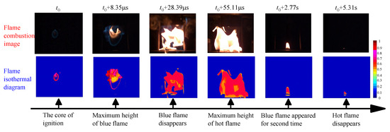As illustrated in Figure 7a, during the early stage of the flame combustion (t0), a blue flash flame appears above the hot plate, characterized by a round, transparent, and low-brightness “ignition core”. This blue coloration is attributed to the production of CH2O and H2O2 during fuel oxidation, which decomposes into free radicals CH and C2 [48]. As combustion progresses (t0 + 8.35 μs), the blue flame rapidly enlarges, leading to further oxidation that produces substantial amounts of carbon monoxide and methane. The central region of the blue flame, being the hottest, initiates the formation of a yellowish-white flame. This results in a dual flame structure where the blue flame envelops the hot flame, as depicted in Figure 7b. Due to the more incredible exothermic reaction and higher temperature of the hot flame compared to the blue flame, the hot flame propagates more rapidly [49], eventually surpassing and merging with the blue flame, causing the latter to disappear. Simultaneously, unburned carbon monoxide, methane, and other substances are fully oxidized to CO2 and H2O, forming the predominant hot flame [50], as shown in Figure 7c. Figure 7c,d indicate that the hot flame dominates the combustion process, comprising over 80% of the total duration. As the concentration of combustible gases diminishes and the hot plate cools, the hot flame’s combustion area gradually contracts into a “cone-like” shape, with only a minimal blue flame remaining at the base. By t0 + 2408.14 μs, the hot flame area further decreases and eventually disappears, leaving only a small area of blue flame.
