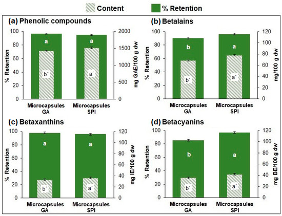 Content and retention (%) of (a) phenolic compounds, (b) betalains, (c) betaxanthins, and (d) betacyanins of microcapsules. Results are expressed as mean ± standard deviation (n = 3). Different lowercase letters indicate significant difference (p ≤ 0.05) between samples. GA: Arabic Gum. SPI: soy protein isolate.