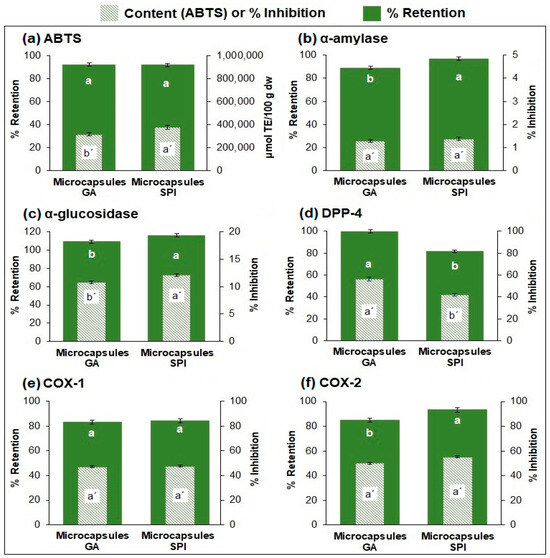 Retention (%) and content of AA, and inhibition of in vitro biological activities of microcapsules. (a) Antioxidant activity, (b–d) anti-hyperglycemic activity (α-amylase, α-glucosidase, DPP-4), (e,f) anti-inflammatory activity (COX-1 and COX-2). Results are expressed as mean ± standard deviation (n = 3). Different lowercase letters indicate significant difference (p ≤ 0.05) between samples. GA: Arabic gum. SPI: soy protein isolate.