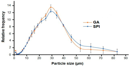 The GA and SPI particles exhibited homogeneous and monomodal distribution (Figure 3). The size of GA and SPI microcapsules ranged from 1.21 μm to 83.65 μm, with most particles concentrated in the 25 to 35 μm range.