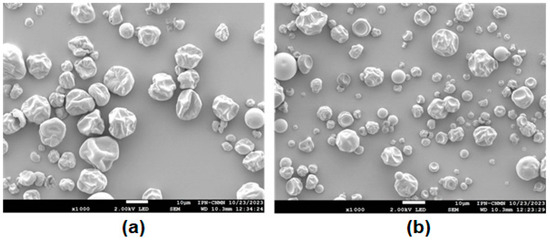 Microcapsules with GA and SPI exhibited shrunken spherical shapes with wrinkled surfaces and concavities (Figure 4), but shrinkage was more pronounced in SPI microcapsules due to both the nature of the wall material (a protein) and the fact that a smaller amount of wall material was used compared to microcapsules with GA (7% compared with 10% respectively); although GA microcapsules also present wrinkled surfaces and concavities, they tend to be more spherical.