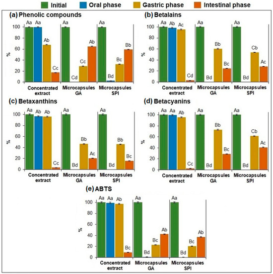 Recovery (%) and bioaccessibility (%) of: (a) phenolic compounds, (b) betalains, (c) betaxanthins, (d) betacyanins, and (e) antioxidant activity of the concentrated extract and microcapsules. Data represent mean ± standard deviation (n = 3). Different capital letters indicate significant differences (p ≤ 0.05) in the same group (initial content, oral, gastric, and intestinal phases). Different lowercase letters indicate significant differences (p ≤ 0.05) in the same sample. GA: Arabic gum. SPI: soy protein isolate.
