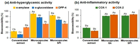 Bioaccessibility of anti-hyperglycemic activity (α-amylase, α-glucosidase, DPP-4) and anti-inflammatory activity (COX-1, COX-2) in the concentrated extract and microcapsules (GA, SPI) are shown in Figure 6a,b. In vitro bioaccessibility of both biological activities was determined only at the end of the digestion process, referring to the initial inhibitory capacity before digestion.