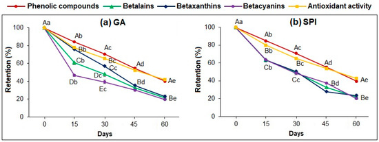 Retention (%) of: phenolic compounds, betaxanthins, betacyanins and antioxidant activity of microcapsules during storage at 30 °C: (a) GA and (b) SPI. Data represent mean ± standard deviation (n = 3). Different capital letters indicate significant differences (p ≤ 0.05) between phytochemical compounds. Different lowercase letters indicate significant differences (p ≤ 0.05) in the same phytochemical compound. GA: Arabic gum. SPI: soy protein isolate.