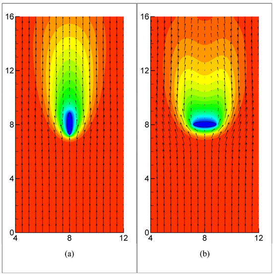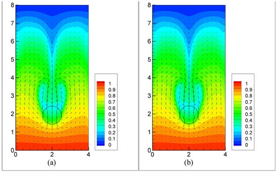 Flow and temperature fields for the flow over a melting elliptic particle at t = 10: (a) A = 0.25; (b) A = 4. The arrows in the figure represent the velocity vectors and the color represents the temperature.