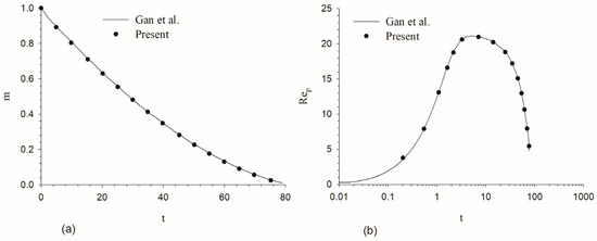 Evolutions of the (a) mass and (b) Reynolds number of a melting particle settling in a vertical channel, as compared to the results of Gan et al. [7].