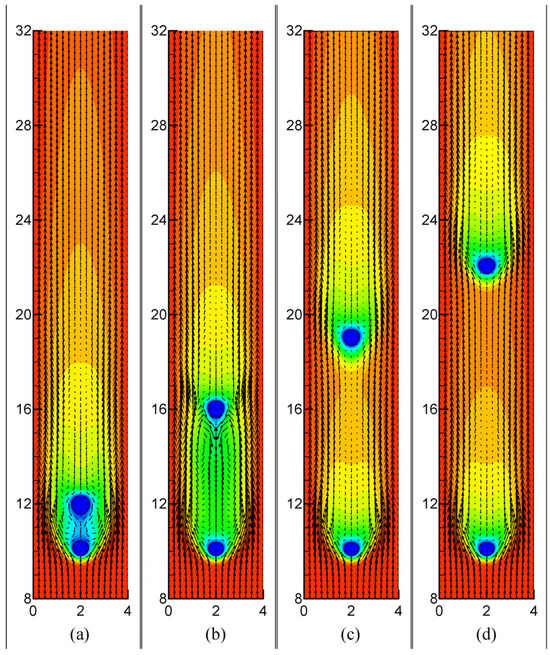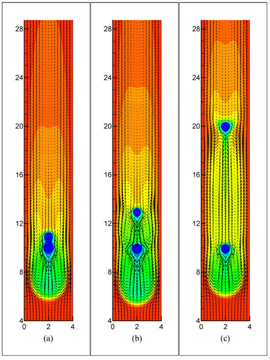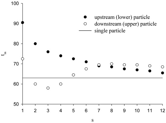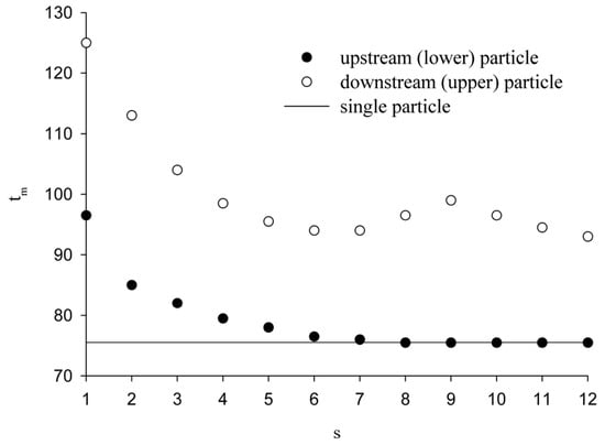 The results on the melting time, and the flow and temperature fields at Gr = 4000 are shown in Figure 12 and Figure 13, respectively. Because the natural convection dominates the flow at Gr = 4000, the ‘upstream’ (lower) particle is immersed in the downward moving colder fluid (Figure 13); thus, its melting time becomes larger compared to the case of a single particle and decreases with increasing distance between the particles. By contrast, the melting of the upper particle can even be accelerated when two particles are spaced neither too close nor too far away, say, 2 ≤ s ≤ 4, as shown in Figure 12. For the moderate distance between two particles, the downward natural convection in this space becomes stronger compared to the single-particle case (as indicated by the comparison between Figure 13b,c), resulting in the accelerated melting of the upper particle.