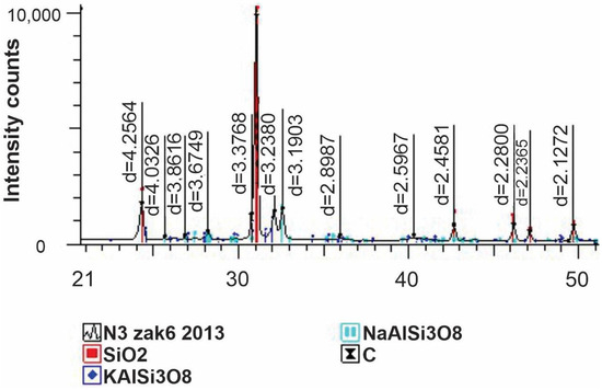 An X-ray phase analysis of coked sand obtained from oil sands through pyrolysis was tested using diffractometer DRON-3M (Figure 1). XRD with peaks at 4.2564, 3.6749, 3.3768, 3.2380, 3.1903, 2.4581, 2.2800, and 2.2365 Å provide information on the composition and structural properties of the samples after high-temperature processing. The shown peak at 3.3768 Å is close to the characteristic peak of quartz (SiO2), indicating that quartz remains in the sand. Usually, quartz is very stable at high temperatures; therefore, its presence is common in materials derived from silicate rocks. Next, the peak at 4.2564 Å indicates the presence of aluminosilicates such as zeolites or clays in the tested sample. The mentioned minerals can remain in the material after the pyrolysis processes; however, they may undergo structural changes. Peaks at around 2.4581–2.2365 Å correspond to the metal oxides, which are often found in oil-derived slags. These metal oxides are stable at high temperatures during pyrolysis. The peaks within the range of 3.1903–3.2380 Å can indicate the carbonate minerals (calcite or dolomite). These compositions may exist as residual phases or form through reactions during pyrolysis involving carbon-bearing components. Oil sand undergoes pyrolysis up to a temperature of 580 °C, which has the potential to modify the initial phases and generate new ones. If the X-ray diffraction peaks of coked sand change in intensity or show up as new peaks, it means that the initial mineral structures are changing or that new crystalline phases are forming. The testing results confirm the presence of quartz, aluminosilicates, metal oxides, and carbonates-containing materials, which define the mineralogical composition of the coked sand.