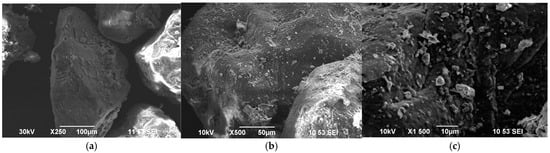 SEM images of coked sands: (a) magnified 250 times; (b) magnified 500 times; (c) magnified 1500 times.
