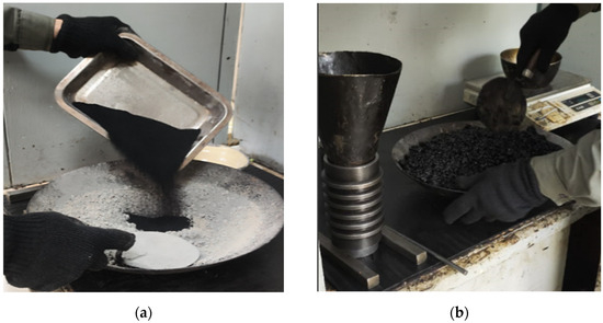 During the asphalt concrete preparation, the materials were mixed using hot technologies (Figure 3). Crushed stone and sand screenings were heated in a drying oven to a temperature of 170–175 °C, bitumen binder was heated to 145 °C, and mineral powder and coked sand were added cold (room temperature).