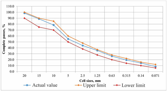 For the investigation of possibilities of using the coked sands from the pyrolysis of oil sands for hot fine-grained asphalt concrete, the compositions of the mineral parts were selected. The curve of the granulometric composition of the mineral part of the mixture is shown in Figure 4.