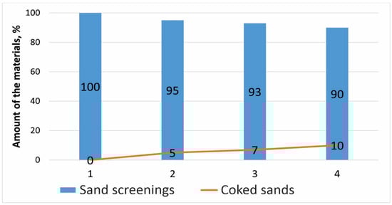 For testing the influence of coked sand on the content of asphalt concrete, the two types of composition were prepared. They are samples without coked sand (control) and samples with the addition of coked sand. Coked sand was added in quantities of 5%, 7%, and 10% of the sand mass from sand screenings. Paving bitumen (BND 70/100) was used as a binder of mineral materials in various sizes. Table 2 presents their exact compositions.