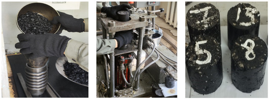 For the purpose of providing analysis of the characteristics of samples, cylindrical asphalt concrete samples were prepared with a height and diameter of 71.4 mm under a constant load of 40 MPa according to ST RK 1218-2003 [32]. After forming, the samples were kept in air-dry conditions for 24 h (Figure 6). While it is possible to mix bitumen with mineral powder at room temperature, it may not be ideal for achieving the best bonding and performance characteristics. Mixing at higher temperatures (170–175 °C) typically promotes better homogeneity, which can lead to improved bonding between the binder and the mineral powder. Room temperature mixing may require more thorough mixing techniques to achieve a uniform blend.