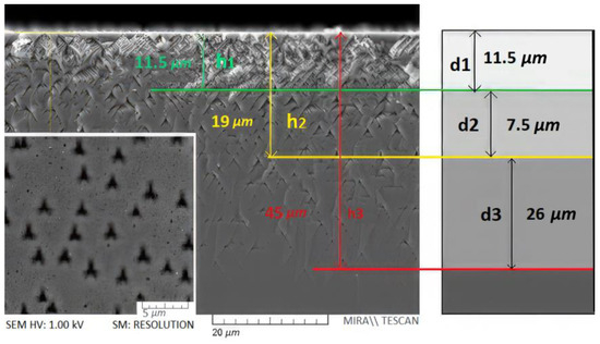A detailed study of the chipping of the por-Si sample showed the formation of more than two layers of different textures (pore diameter, porosity) (Figure 3). The following layers could be distinguished in depth from the surface to the substrate: