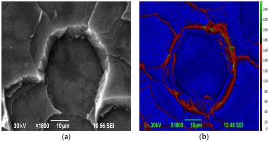 The identity of the surface structure was also noticeable at different scales of consideration (Figure 1a,b). The following image shows the stepped structure of the walls of the macropores (Figure 2).