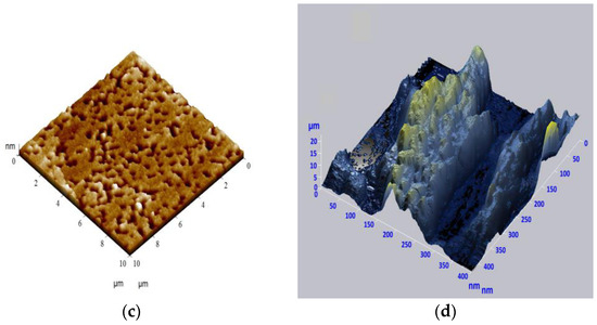 The atomic force microscope was used to study the micro and nanoscale surface morphology (AFM) JSPM-5200 (JEOL, Akishima, Japan). The depth of the vacuum was 10−6 mm Hg. AFM AC scanning mode, 13-minute image scanning speed, and NSC35/AIBS probe brands were used.