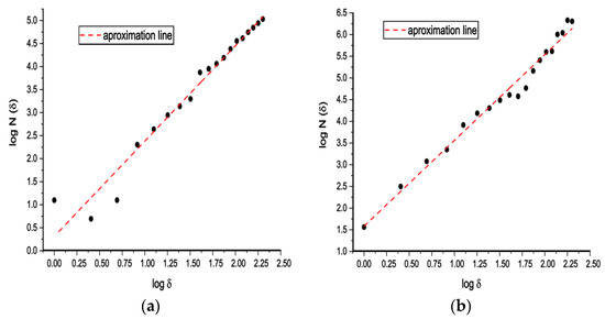 The logarithmic transformation of this law allows us to obtain a linear dependence and a graph with a slope of D. Thus, the dimension of fractality can be estimated by the gradient of the graph lnN(δ) relative to lnδ, given by the following expression: