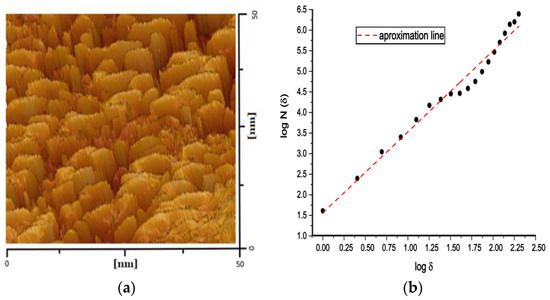 The determination of the level of fractality (D = 1.96) for the second level of the surface hierarchy (micropores) is presented in Figure 8b. The relationship between the macro and micro levels of the hierarchy is proved by the presence of the same fractal dimension.
