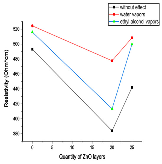 Electrical resistance measurements were performed on the TRM-0.1/100i device (JSC Telecom—STV, Russia, Zelenograd). A change in resistance was observed under the influence of water vapor (0.5 mL) and ethyl alcohol vapor (0.5 mL) on the surface of the sample. The measurement is based on the determination of magnetic field energy losses due to eddy currents occurring in the material. An alternating magnetic field is created by the inductance coil of the sensor located at the end of the measuring probe. The inductance coil of the sensor and capacitors located on the computing board of the measuring probe form a resonant circuit. When the measured material comes into contact with the magnetic field of the sensor, the Q-factor of this circuit decreases, which causes a decrease in the amplitude of vibrations in the circuit. The amplifier circuit with a tracking bridge, assembled on a computer board, maintains the oscillation amplitude constant, but as a result, the voltage drop on the ballast resistor increases. The change in the value of the voltage on this resistor is proportional to the value of the electrical resistivity at a given point of the plate. Next, this voltage is supplied to the amplifier board. Then, the amplified signal is sent to the control board, where it is converted into a digital code and translated into the value of the electrical resistivity in ohms*sm.