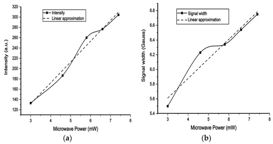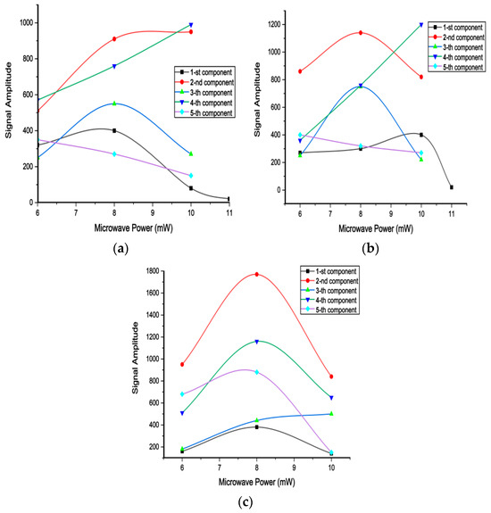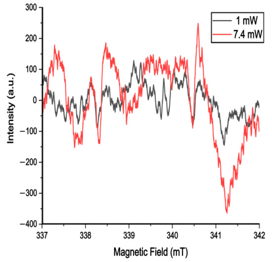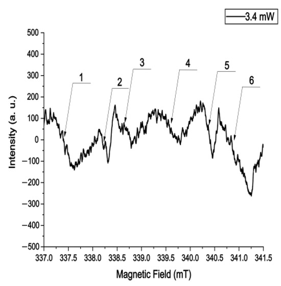 The behavior of the components, after annealing at 500 °C, under the influence of gradually increasing microwave radiation power (6–11 mW) is similar (Figure 21c). This indicates that an energetically stable state has been achieved, and transitions between magnetic sublevels occur uniformly.