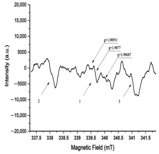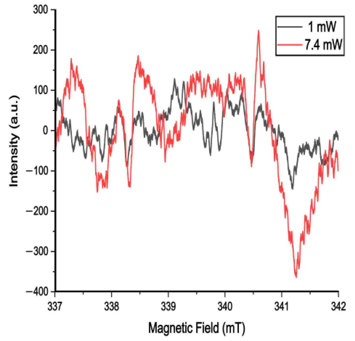 An EPR spectrometer JES-FA200 (JEOL, Akishima, Japan) was used to study the paramagnetic properties. Measurements were made at ~9.4 GHz (X-Band) and ~35 GHz (Q-Band). Microwave frequency stability: ~10−6. Sensitivity = 7 × 109/10−4 Tl. The resolution was 2.35 μT. The output power ranged from 200 mW to 0.1 μW, with a Q-factor of 18,000.