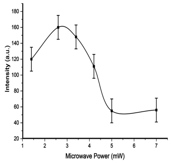 The dependence of the intensity of the fourth component of the spectrum on the sequential increase in microwave power for a sample with 25 ZnO layers.