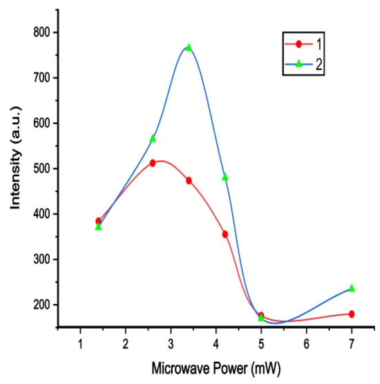 Comparison of the dependences of the intensity of the fourth component of the spectrum on the sequential increase in microwave power for samples: 1—25 layers of ZnO, 2—without deposition ZnO.