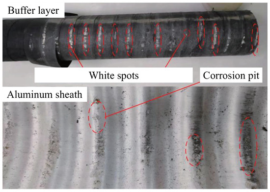 Buffer layer ablation has become a frequent high-voltage cable fault in recent years, causing serious negative impacts on the safe operation of power transmission systems and attracting widespread attention from both academia and industry [4,5,6]. For the normal operation of high-voltage cables, as shown in Figure 1, the buffer layer plays a crucial role in the cross-sectional diagram, including maintaining good electrical contact between the insulation shielding layer and the aluminum sheath, uniform electric field distribution, cushioning mechanical stress, and absorbing moisture. However, it has been observed in practice that the buffer layer is a common site for faults, with typical examples being buffer layer ablation faults, mainly occurring in cables after five years of operation. Since these faults are internal to the cable and difficult to directly monitor and assess, a large number of ablation hazards cannot be discovered and addressed in a timely manner. Figure 2 shows the dissection of a cable with a buffer layer ablation accident. White spots can be observed on the buffer layer, with the presence of white substances on the surface, and corresponding corrosion pits appear on the aluminum sheath [7]. To gain a deeper understanding of buffer layer ablation faults, experts and scholars have conducted research on the causes of these phenomena and the underlying mechanisms from different perspectives.