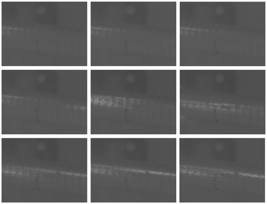 In this study, a section of ZC-YJLW03 64/110 high-voltage cable was used as an experimental sample, and fault defects were simulated. A voltage regulator was used to gradually increase the voltage between the aluminum sheath and the outer semi-conductive layer to 80 V. During this process, an HIKMICRO infrared thermal imager was used to record a sequence of cable infrared images that reflect temperature changes, which served as experimental test data. In this experiment, nine images were selected from the sequence as test images, as shown in Figure 3. It can be observed that the directly collected thermal infrared images have issues such as unclear detail levels, unobvious visual representation of temperature differences, and significant imaging noise impact, which are not conducive to defect detection and assessment. Therefore, it is necessary to enhance the thermal infrared image to better reflect temperature differences, which will facilitate subsequent ablation defect detection and assessment. The primary challenge lies in enhancing detail differences while effectively suppressing noise.